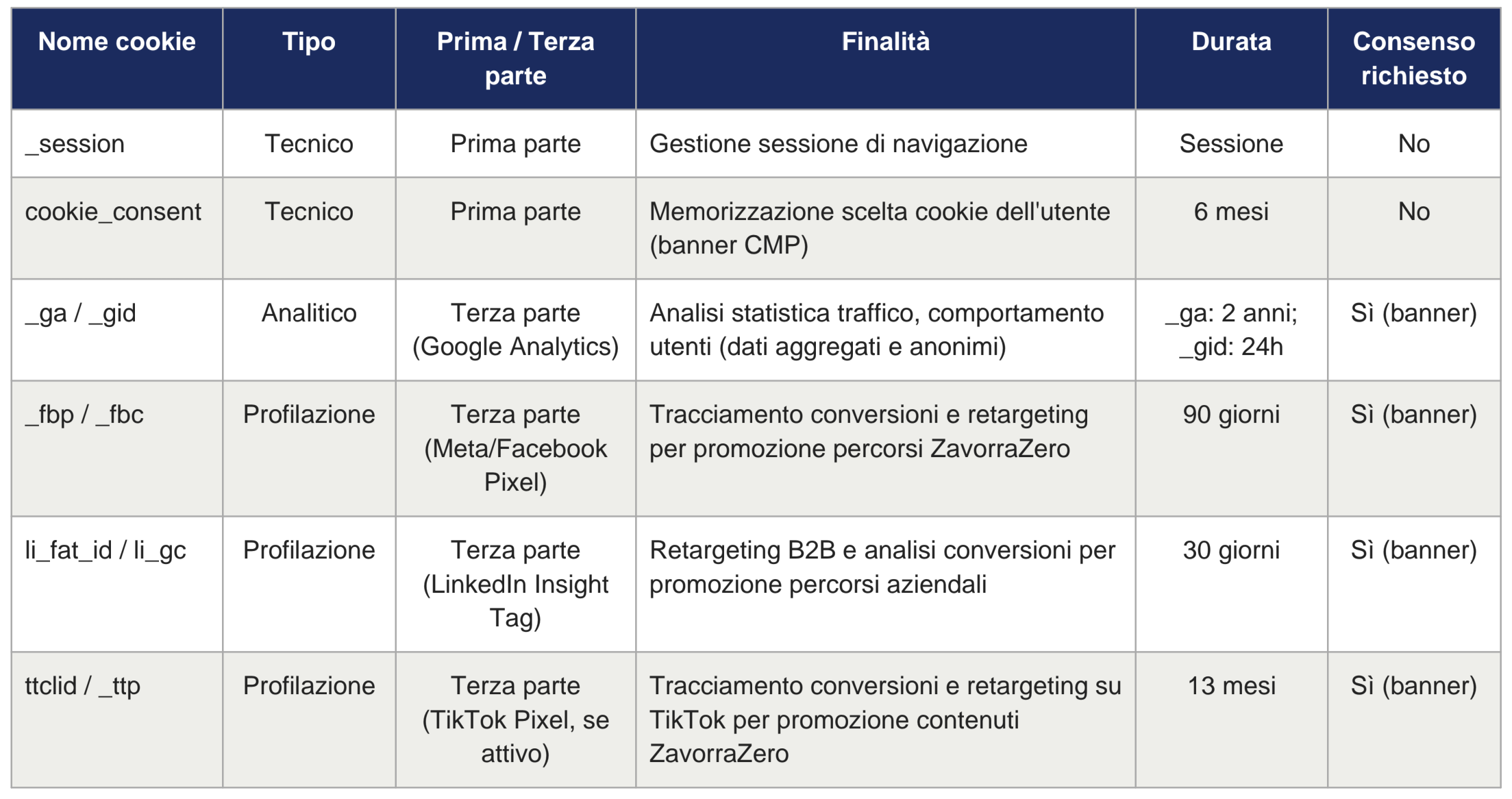 L'elenco è aggiornato alla data di pubblicazione. In caso di modifiche all'utilizzo dei cookie, la tabella sarà aggiornata